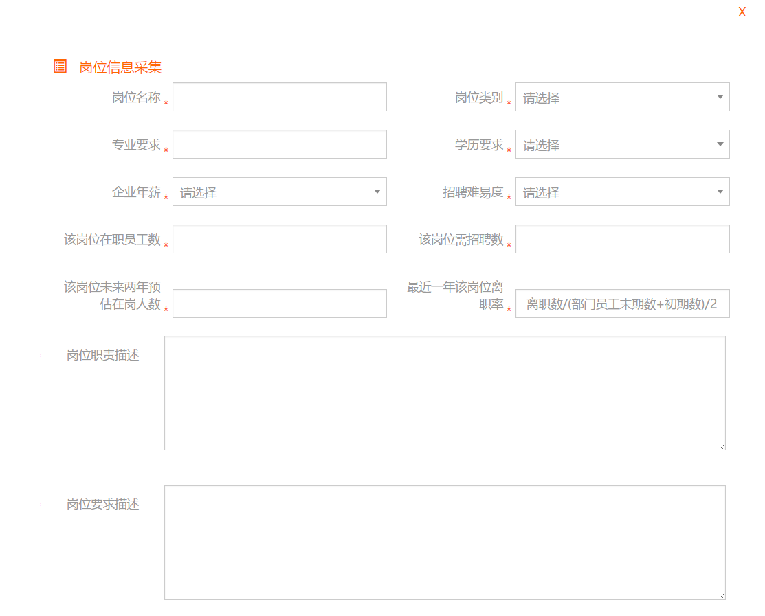最近一年该岗位离职率:如提示表述,为最近一个可统计的年度中 离职数÷(该员工所在部门年初总员工数+年末总员工数)÷2,请直接填写小数即可,如0.1。