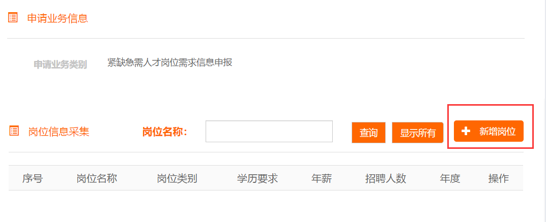 进入业务页面后,看到本页面,首先点击【新增岗位】按钮,弹出如下界面