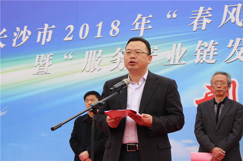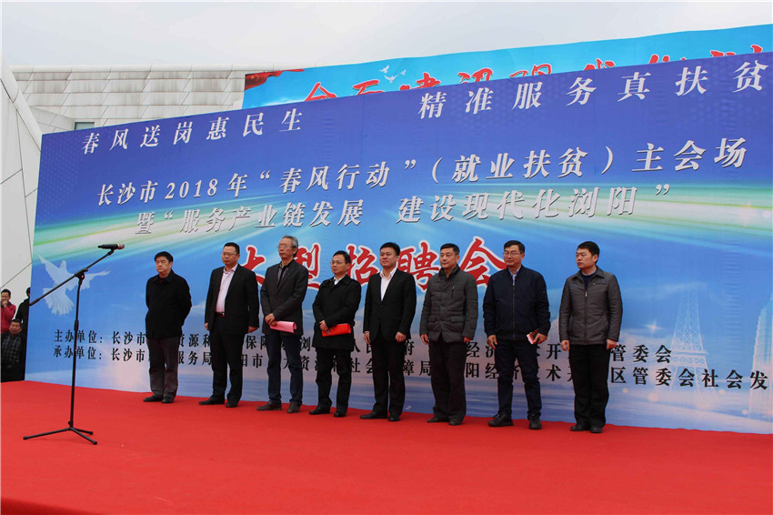 2018年2月27日上午,由长沙市人力资源和社会保障局、浏阳市人民政府、浏阳经开区管委会联合主办的长沙市2018年“春风行动”(就业扶贫)主会场暨“服务产业链发展、建设现代化浏阳”大型招聘会在浏阳经开区金阳文化艺术中心广场成功启动。湖南省就业服务局副局长王鲁普、浏阳经开区党工委副书记、管委会主任谈文昌,长沙市就业服务局局长易伟军,浏阳市委常委、常务副市长吴敏出席活动。